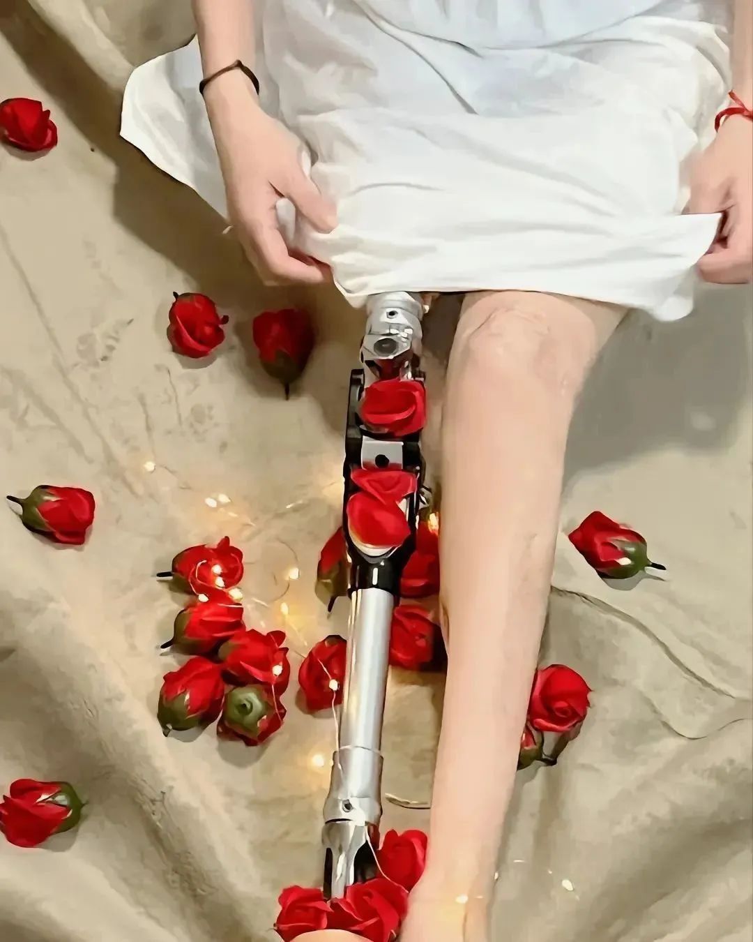 去年这个时候,牛钰发过一张照片。她平坐着,小腿伸得笔直,腿边散落着红色的花瓣。她说:“春天快到了,我的小钢腿也许会长出玫瑰花。”
