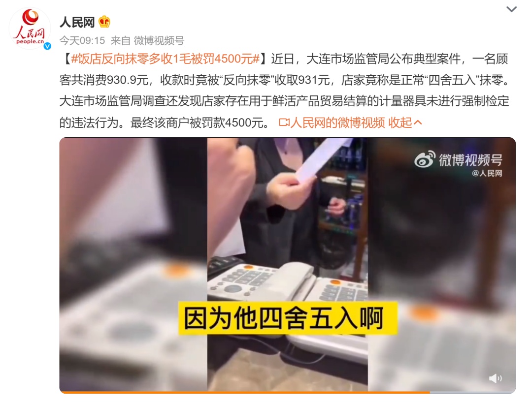 “辽宁大连一男子和朋友在海鲜大排档吃饭,消费930.9元竟被收931元”,此事曾在网上刷屏,冲上热搜并引发热议。