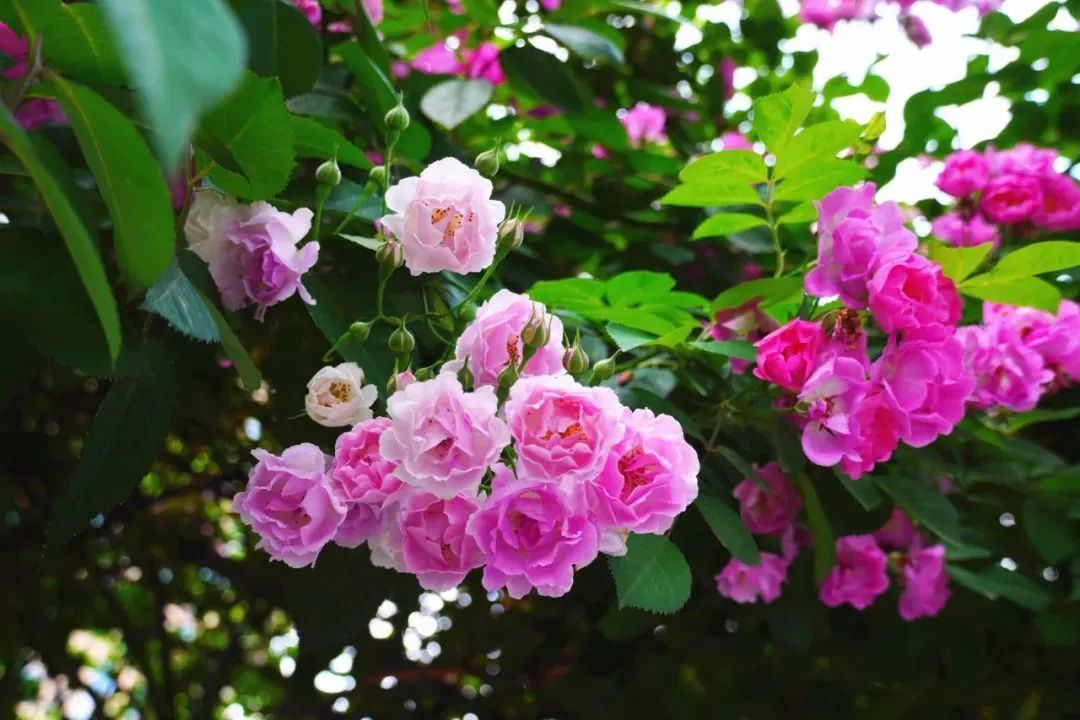 在赵伍路与秉祥巷的转角,一簇簇蔷薇同样开得正盛。在光影下迎风而动,花团锦簇,娇俏动人。偶然经过,与之擦身,花香落满肩头,惊艳了时光。