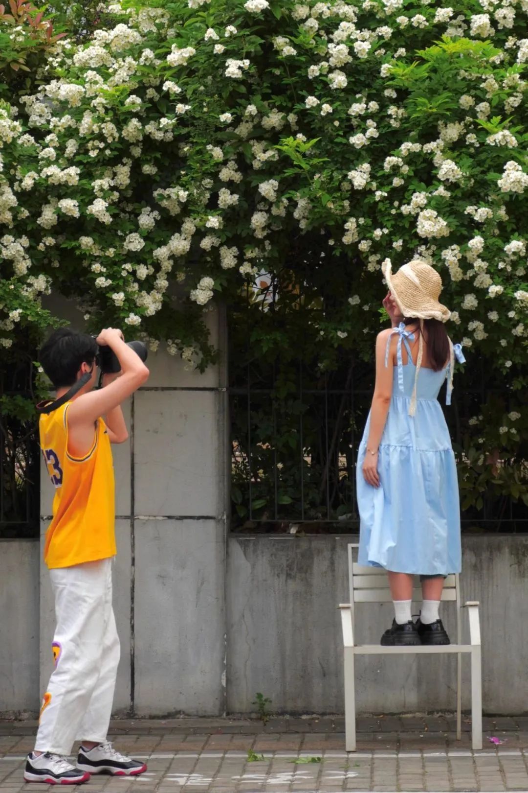 除了常见的粉色系蔷薇,拐角的另一侧还有一整面白色系野蔷薇。少女的明艳抓住了行人的目光,谁不想在这样的红绿灯十字路口多停留一会。