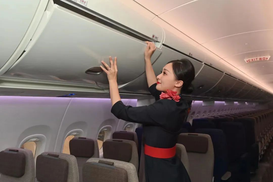 东航为全球首架C919配备了两舱布局,164座,包括8个公务舱和156个经济舱,均选用完全自主研发的新一代国产客舱座椅。“乘坐舒适宽敞”将是C919今后服务旅客时鲜明的亮色,客舱还选装了共20个12英寸吊装显示器,支持高清1080P电影放映,这也是东航单通道机队首次引入1080P的节目装载。