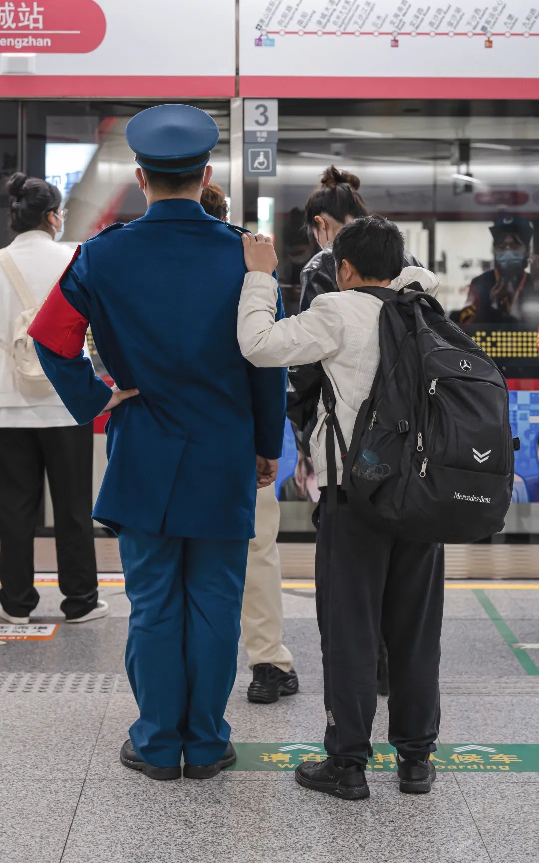 一名乘客手搭着地铁工作人员肩膀
