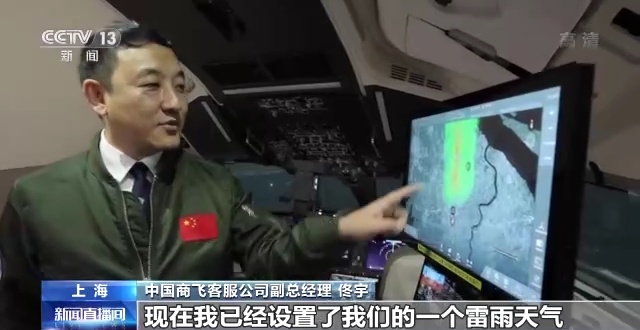 中国商飞客服公司副总经理 佟宇:这里就是我们C919的飞行模拟机,我们可以出各种训练的科目和不同的情景,现在我已经设置了一个雷雨天气,整个后面模拟机上面显示就是雷雨情景,目前这个驾驶舱就是和C919 1:1等比例的驾驶舱。