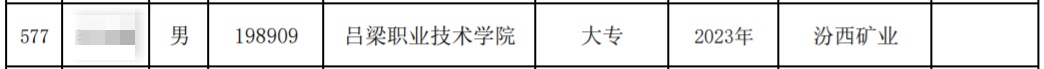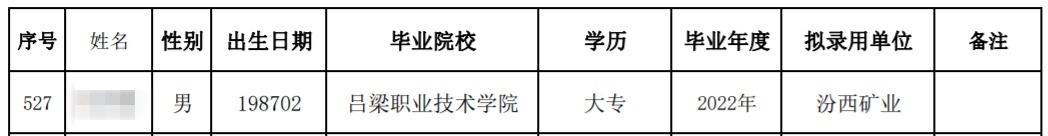 6月13日的公示名单显示,这两名80后分别于2022、2023年毕业于吕梁职业技术学院,录用单位均为汾西矿业。