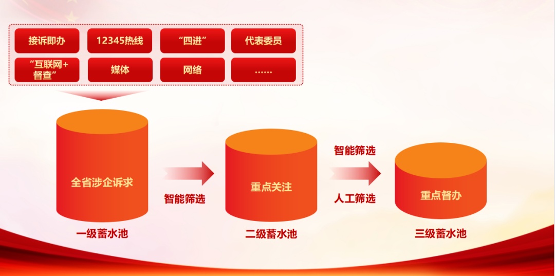持续优化营商环境,解决企业问题就要多听企业诉求。平台始终把企业呼声作为“第一信号”,链接了省级企业诉求“接诉即办”平台、各市12345政务服务便民热线、“互联网+督查”、人大代表、政协委员、媒体等渠道数据信息。在此基础上,通过三级“蓄水池”对问题分类定向,让企业心声直达、诉求直通、问题有解。