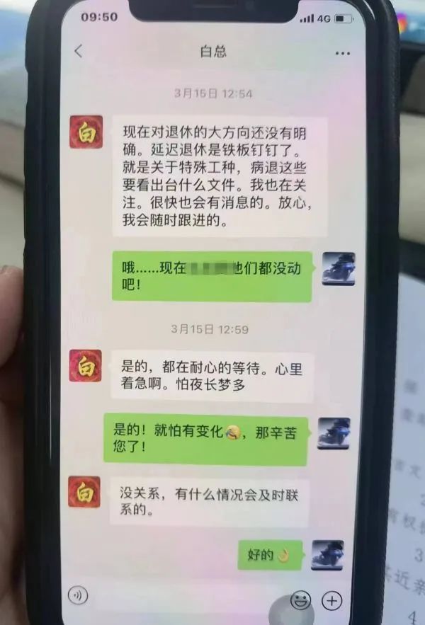 在一则受害人与嫌疑人白某的聊天记录中,白某称:“现在对退休的大方向还没有明确……病退这些要看出台什么文件,我也在关注,很快会有消息,放心,我会随时跟进。”