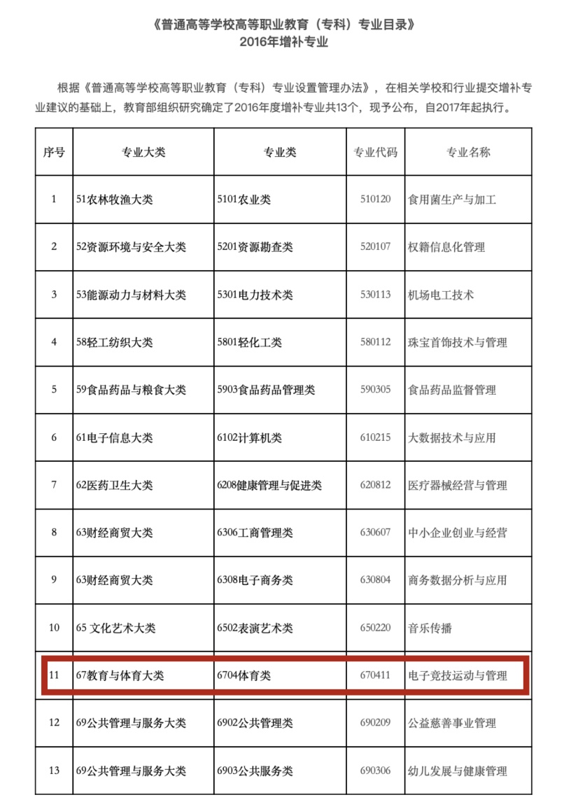 2016年,教育部发布《普通高等学校高等职业教育(专科)专业目录》,“电子竞技运动与管理”成为13个增补专业之一。随后,四川、湖南、安徽等多地高校开设电竞专业。据不完全统计,国内目前有十多所本科院校和几十所高职院校开设电竞相关专业,近几年每年都有院校申报开设。