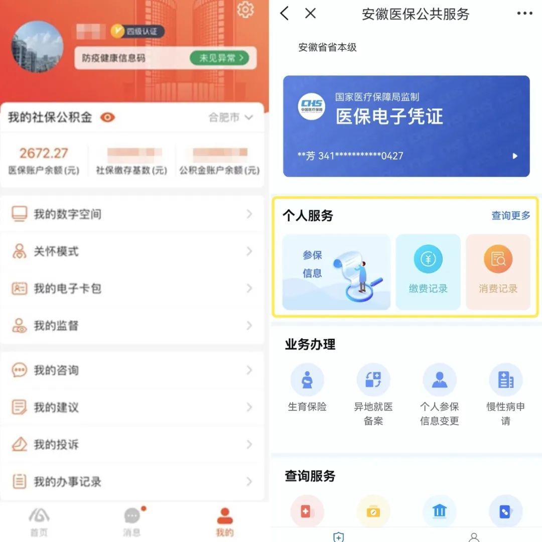 验证通过后,即可在“我的社保公积金”栏目显示“医保账户余额”。点开“医保账户余额”,一键进入“安徽医保公共服务”页面,可快速查询个人参保信息、缴费记录和消费记录等。(如果页面提示无法查询,需将首页分厅切换至缴存地再进行查询)