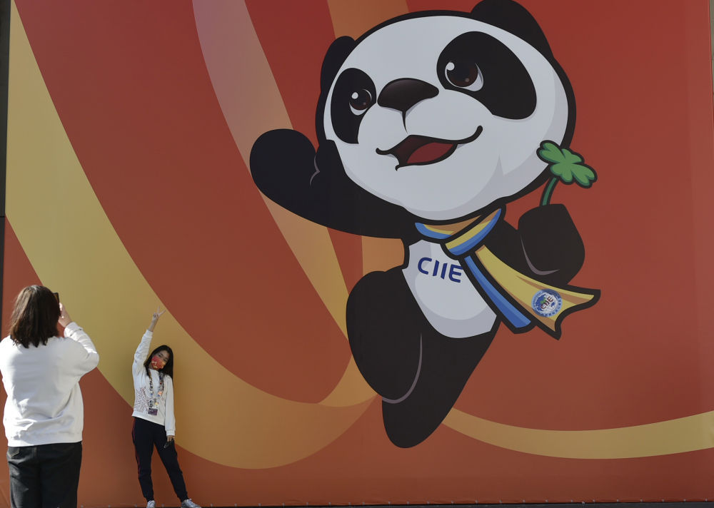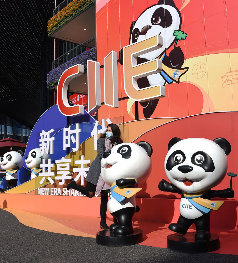 2019年11月4日,进博会吉祥物熊猫“进宝”在国家会展中心(上海)南广场安放到位。新华社记者 殷刚 摄