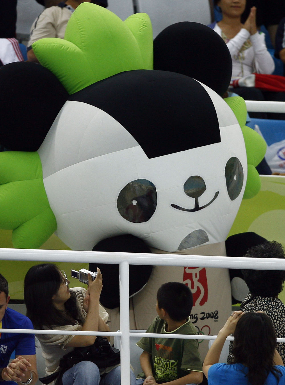 2008年8月14日,福娃“晶晶”来到观众席为选手加油助威。新华社记者丁旭摄