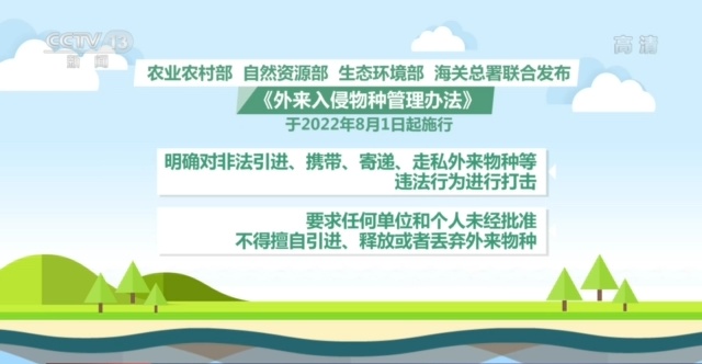 为了全力“封堵”外来物种入侵,农业农村部、自然资源部、生态环境部、海关总署今年联合发布了《外来入侵物种管理办法》,并于8月1日起施行。其中就明确了对非法引进、携带、寄递、走私外来物种等违法行为进行打击,并要求任何单位和个人未经批准,不得擅自引进、释放或者丢弃外来物种。