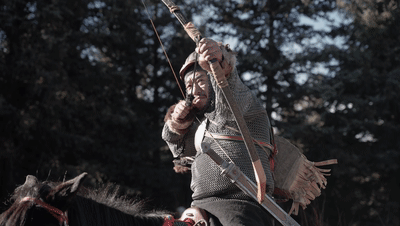视频中最燃的片段,要数降泽多吉骑马、射箭,在龙灯草原遥想当年的英雄事迹。