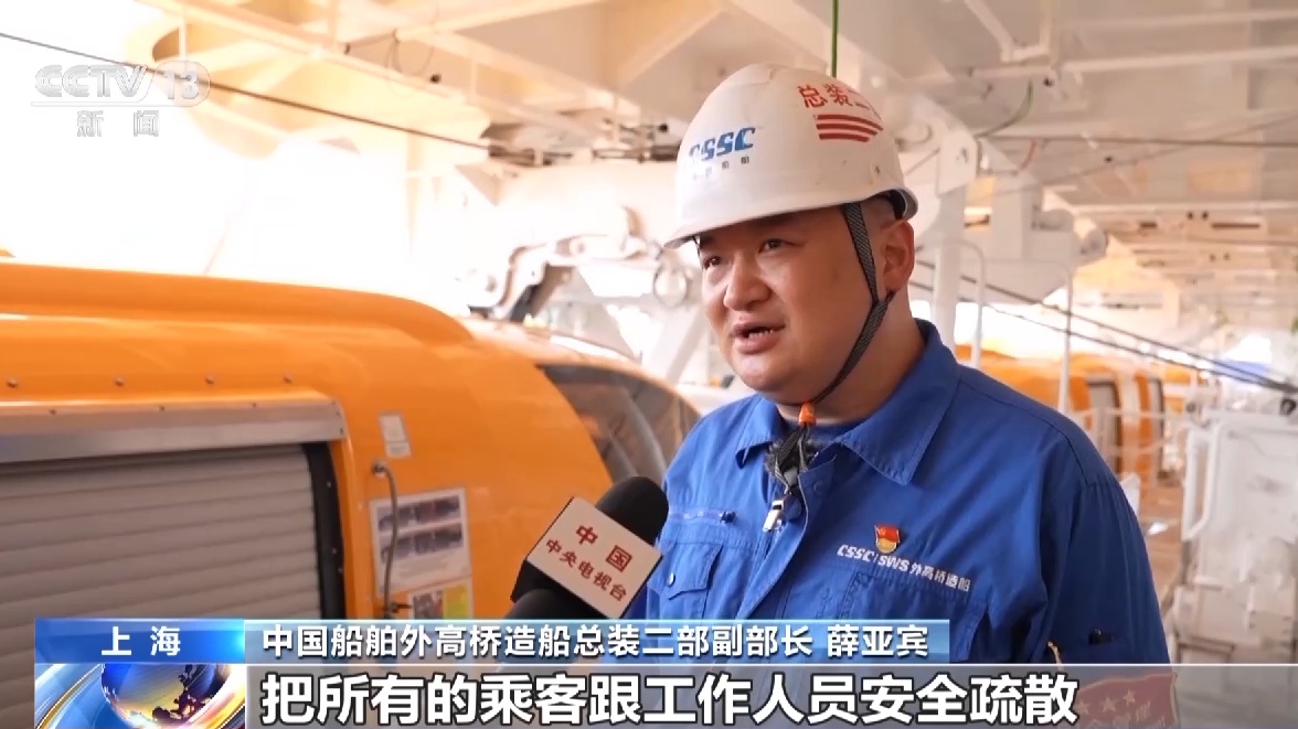 中国船舶外高桥造船总装二部副部长 薛亚宾:我们原来在干坞里面,不具备试验条件。我们所有的救生艇要能够把所有的乘客跟工作人员安全疏散,所以救生艇是比较重要的安全设施。