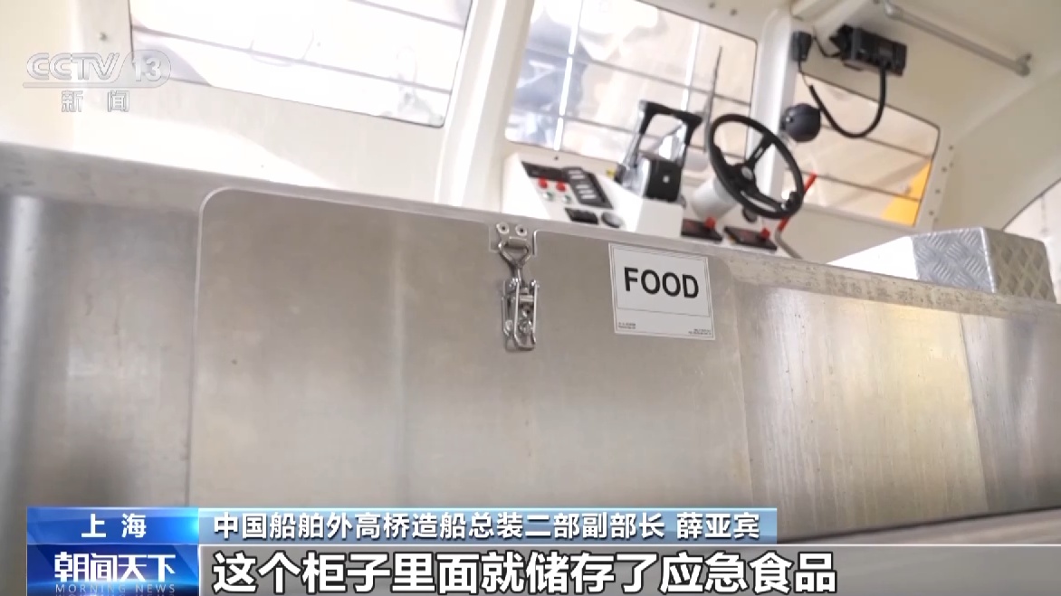 中国船舶外高桥造船总装二部副部长 薛亚宾:这个柜子里面就储存了信号弹;这个柜子里面就储存了应急食品,像压缩饼干之类的;这些就是饮用水柜,每个座位下面都会有,满足救生过程当中所有人员的日常所需。