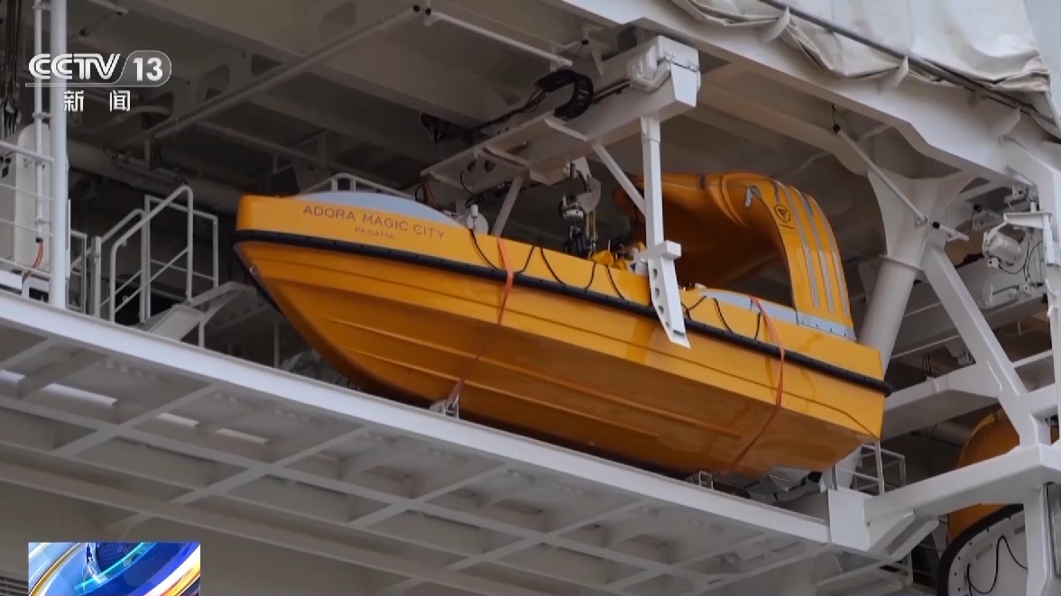 总台央视记者 吴天白:我现在就在邮轮的四甲板,这层甲板也是停放救生艇的位置。我身边的救生艇长13.35米,宽5米左右,高4米左右,别看体积不大,但满载能容纳314人。像这样的救生艇全船一共有20艘。