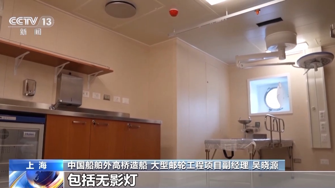 中国船舶外高桥造船大型邮轮工程项目副经理 吴晓源:在诊室里面配备有基本的手术设施,包括无影灯,在船上可以进行一些应急的处理。在我们左手边,这边是一间药房。整体内装部分大约完成85%,在8月底就能够完成全船内装安装工作。