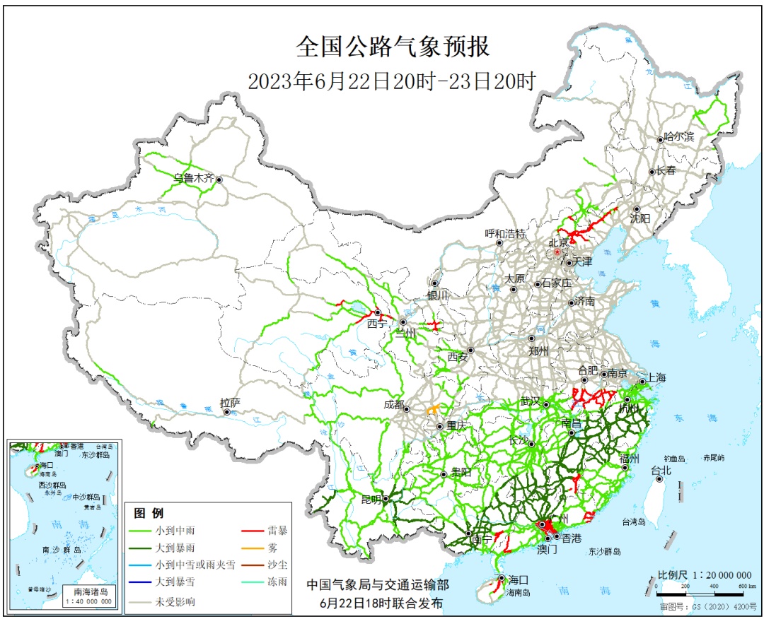 6月22日20时至23日20时,云南东部和西北部、广西中西部和东北部、广东中北部、湖南南部、江西中南部和东北部、福建西北部、浙江中南部、安徽南部等地部分地区有大到暴雨,其中,江西东北部、浙江西南部、福建西北部、湖南南部、广西东北部、广东北部等地部分地区有大暴雨。四川东北部等地局地有雾。河北北部、辽宁西南部、安徽中南部、江西东南部、广东南部、广西东南部、海南岛北部、青海东北部、宁夏南部等地局地有雷暴。另外,川藏铁路配套工程公路的部分路段受中雨影响,需防范对施工建设和物资运输的不利影响。