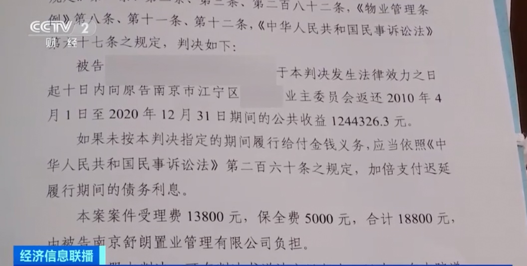 据此,南京市江宁区人民法院一审判决物业公司向小区业委会返还2010年至2020年期间的小区公共收益124万余元。物业公司不服,提起上诉,南京市中级人民法院二审驳回上诉,维持原判。