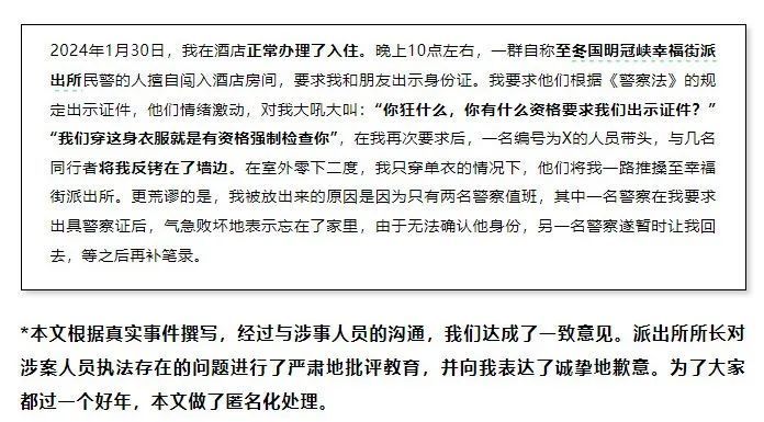 近日,一篇《要求查房人员出示警察证后,我被背铐至派出所》的文章引发关注。文章作者称,因让查房人员出示警察证件,自己被对方用手铐强制带走。