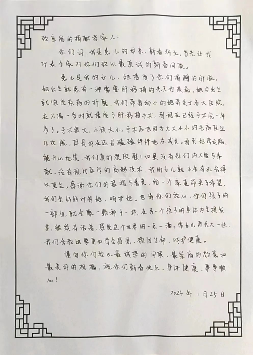 “致亲爱的捐献者家人:你们好,我是患儿的母亲……如果没有你们的大爱与奉献、没有现代医学的高超技术,我的女儿就不会有机会得以重生……你们孩子的一部分,就会像一颗种子一样,在另一个孩子的身体内生根发芽……”