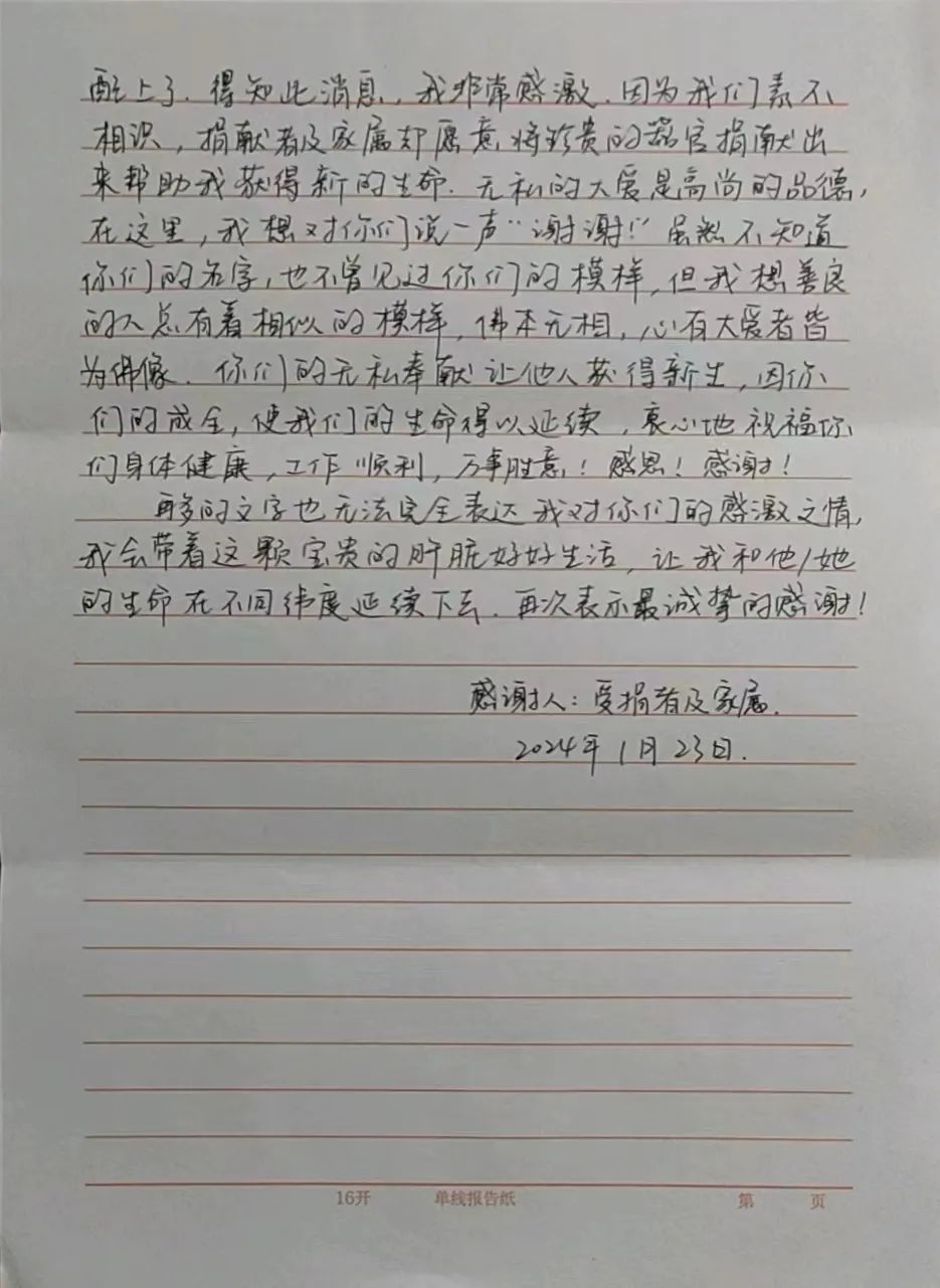 器官移植受者的家属的感谢信。