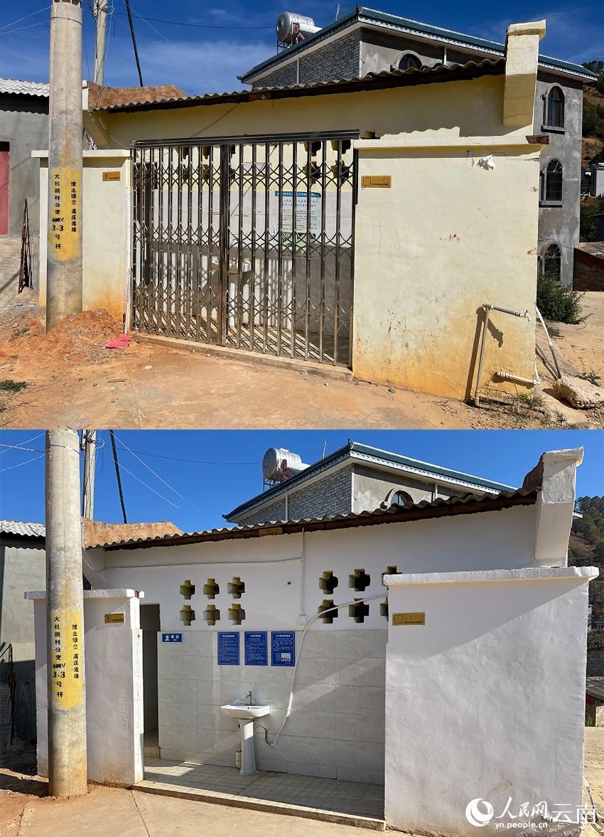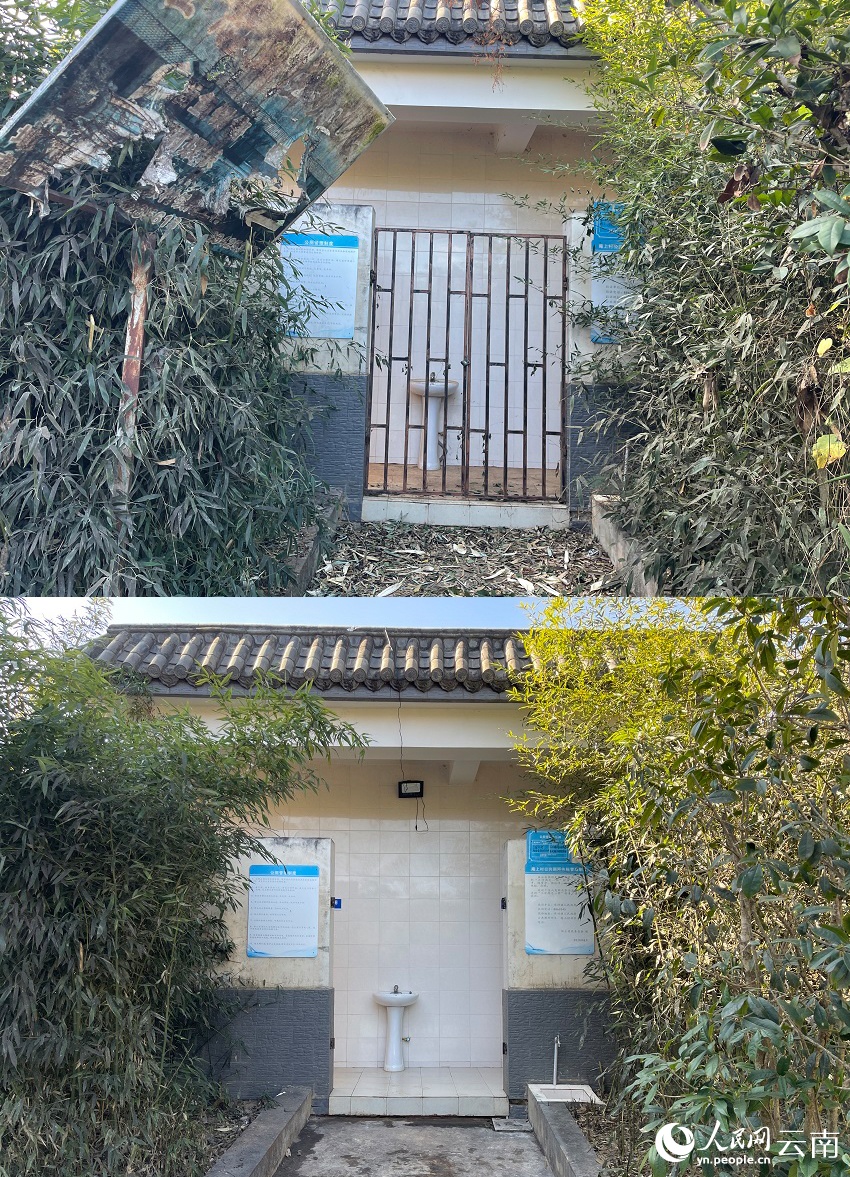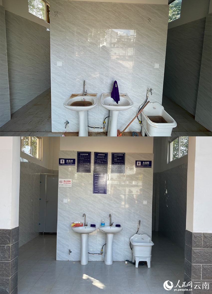 杜朗村幼儿园附近的卫生公厕整改前后对比图,上为整改前(拼版照片)。人民网记者 程浩摄