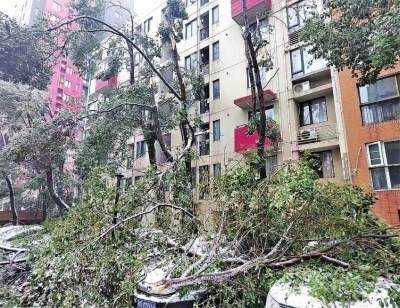 王先生所在的小区不仅树多,而且长势茂密。“很多树都有五层楼那么高,还有的树有七八层楼那么高。”王先生走在小区里,看到有的大树直接从主干被劈断,凌乱的树干有的倒在路上,有的压在汽车上,一些汽车被砸出了凹陷。