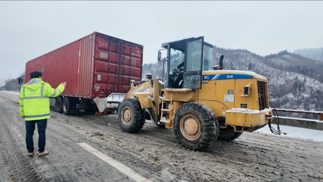 2月3日上午7点,福银高速公路汉十方向土关垭大上坡路段,因突发低温降雪,部分大型货车无法顺利爬升坡顶,动力轮持续打滑,大批车辆开始积压。通过紧急调集装载机,采取逆行上道,对无法爬越坡顶的车辆进行拖拽和顶推脱困处理。