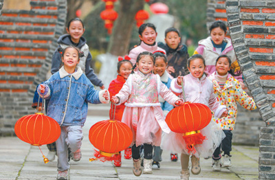 孩子们在荻港村中举着灯笼,欢快奔跑。