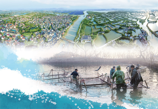 上图:荻港村的桑基鱼塘与村庄、道路共同组成一幅美丽乡村画卷。