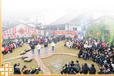 “开辟流动实景舞台是我们今年‘村晚’的一大创新。”吴勇介绍,“今年‘村晚’在刘家祠堂和一个农家小院布置了两处会场,中间隔着万福老街和万福古桥。我们借鉴不少旅游景区时兴的巡游活动,在两个舞台会场转场间隙,带领乡亲和游客们在老街巡游,给大家带来一场沉浸式演出体验。”