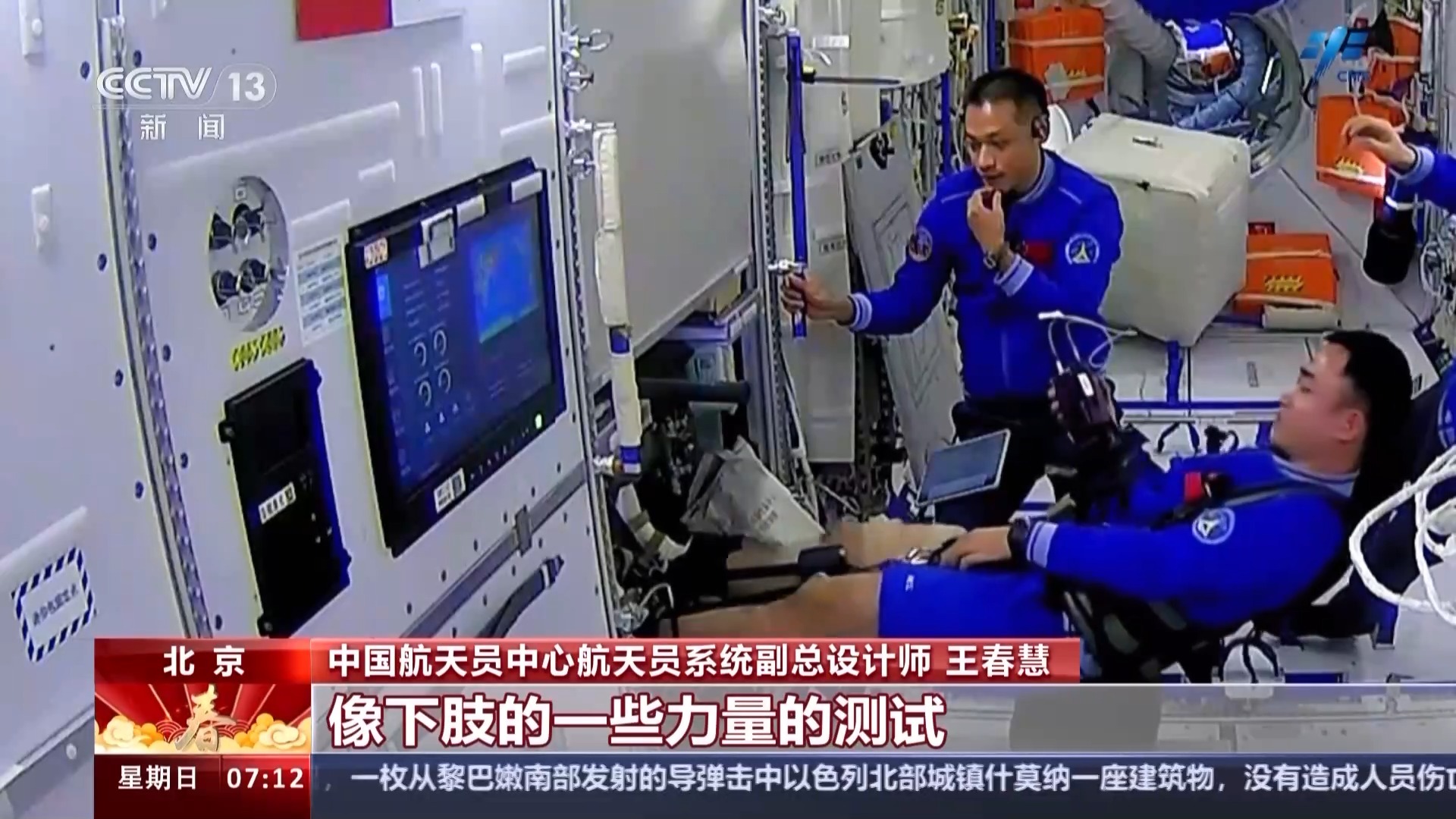 中国航天员中心航天员系统副总设计师 王春慧:关于航天医学和人因工程方面的实验是一直持续在开展的,像下肢的一些力量的测试,运动学特性的研究,然后也包括视功能相关的研究,以及包括他自己的一些身体健康状况的医学的测试,这些工作都在持续开展。