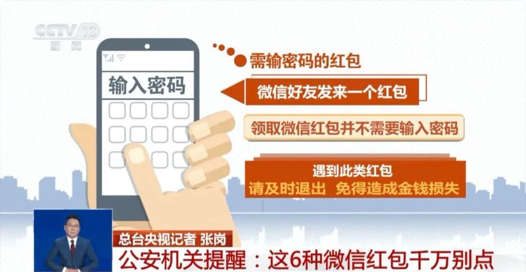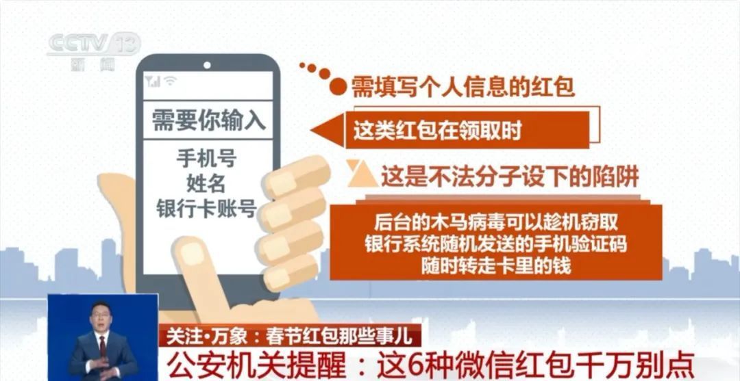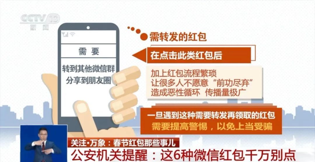 除了避免红包攀比,民众还要警惕不要落入红包陷阱。过年期间抢红包“拼手速”成为一种新玩法,但一些不法分子却打起了坏主意,制造假红包企图骗取钱财,公安机关提醒,如果看到这6种微信红包千万别领。