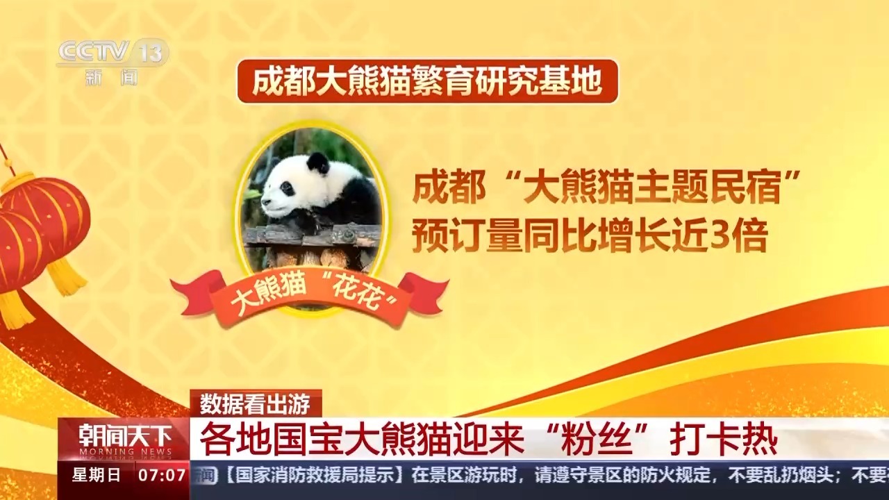 而成都大熊猫繁育研究基地的“花花”也吸粉无数,在今年春节吸引了更多客人前往。途家数据显示,春节期间,成都“大熊猫主题民宿”的预订量同比增长近3倍。