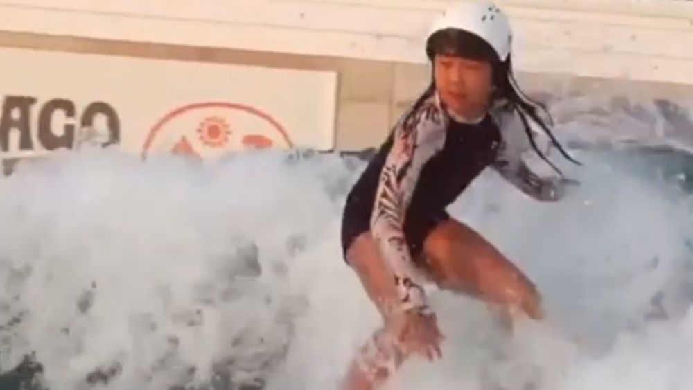 周苡竹在造浪池中进行冲浪训练。