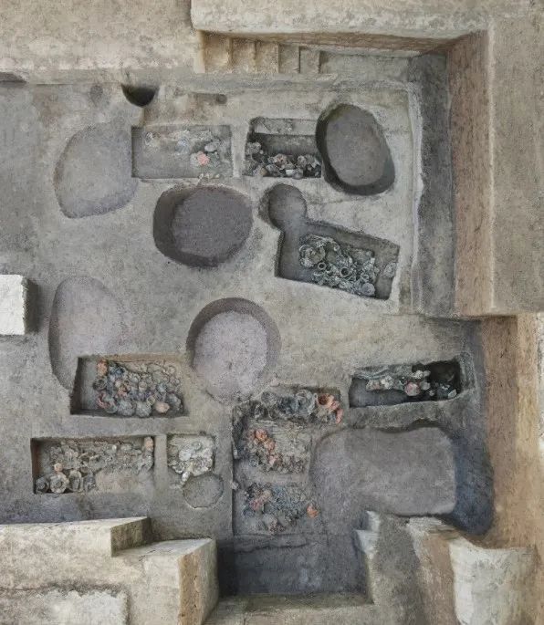 △ 随葬玉器出土现场(玉琮、玉钺与玉环、玉锥形器、玉钺)