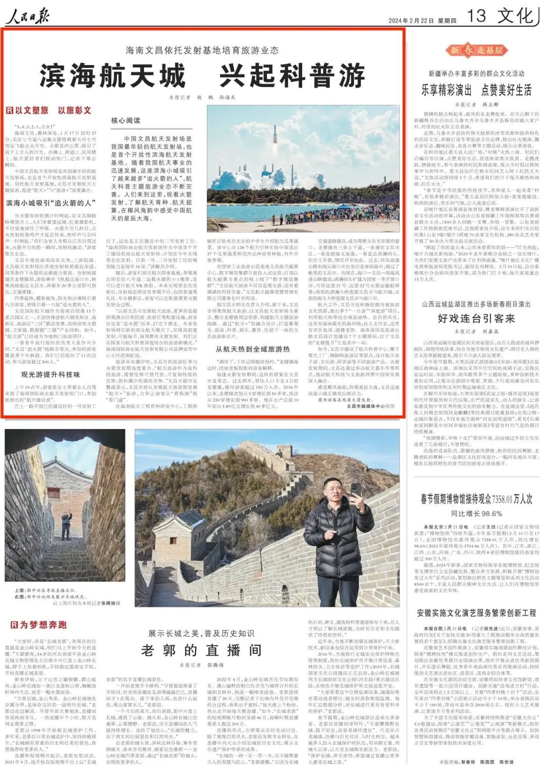 “以前文昌市发展航天旅游,更多的是提供观测点位和民宿、农家乐等配套设施,游客往往是‘追火箭’而来,打完卡便走。未来发射场将在新的商业航天模式下,实现高密度发射,可能每月、每周都有火箭发射。我们正在探索与航天科普深度结合的旅游新模式。”海南国际商业航天发射有限公司品牌宣传中心主任范南虹说。