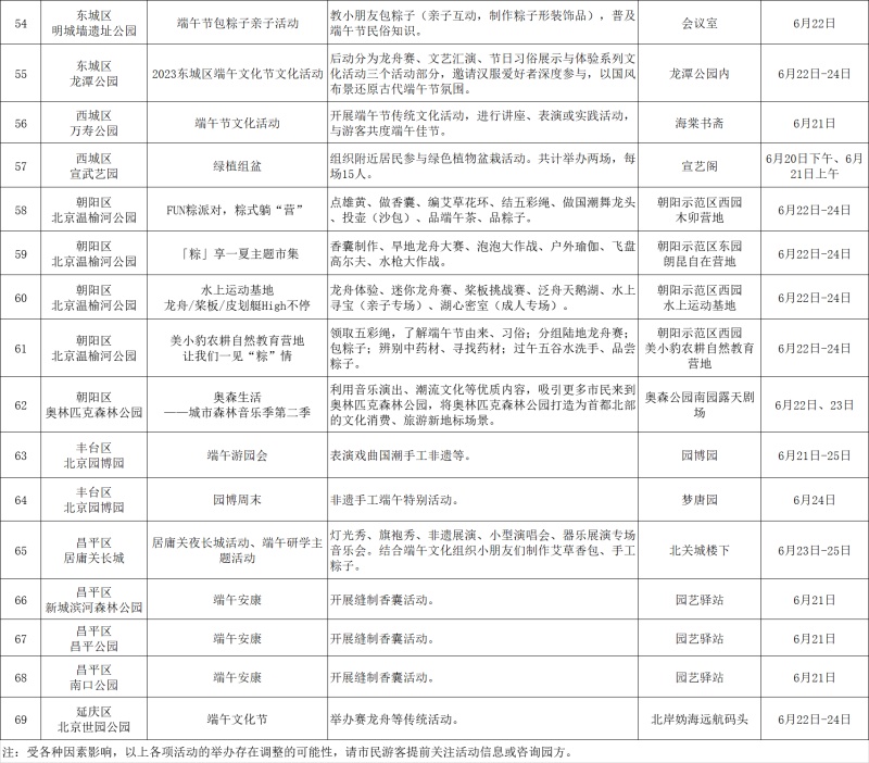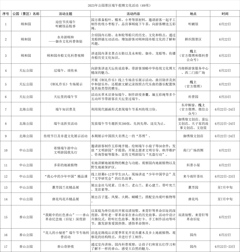 插艾草、赛龙舟、佩香囊、吃粽子……全市公园也根据自身特色,为市民游客准备了各具特色的民俗文化。端午节当天,颐和园的听鹂馆、景山公园的永思殿、玉渊潭公园的科普木屋和东城区明城墙遗址公园中都将邀请市民游客一起亲手制作粽子,体验传统文化。天坛公园中,“天坛里的端午节”主题活动将从草木识香知端午、制作辟疫香囊、编五彩绳等多个互动环节带游客在天坛里感受端午文化。中山公园将举办“寄情端午游中山文明游园我先行”活动,邀请游客制作五彩绳手链、绘制端午小扇子等50余件,同时开展文明游园宣传引导。香山公园的“仲夏香事”香山香文化精品市集,设有“射五毒”投壶、“赢五彩丝线大转盘”等免费互动体验区。国家植物园(北园),将邀请老师讲解端午习俗,科普所选草本植物的基础知识,带领游客制作散发着天然草本植物香气的小香囊。赛龙舟,迎端午。龙潭公园中,“2023东城区端午文化节文化活动”将上演精彩龙舟赛,同时还邀请汉服爱好者体验以国风布景还原的古代端午节氛围。郊区的公园也是精彩不断。温榆河公园的水上运动基地也有龙舟体验、迷你龙舟赛、泛舟天鹅湖、水上寻宝(亲子专场)等各种精彩活动。延庆区的市民可以到北京世园公园观看端午文化节赛龙舟等传统活动。