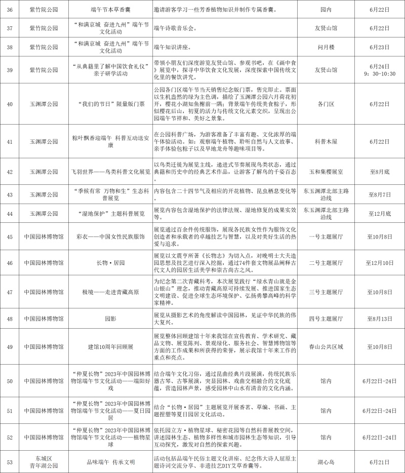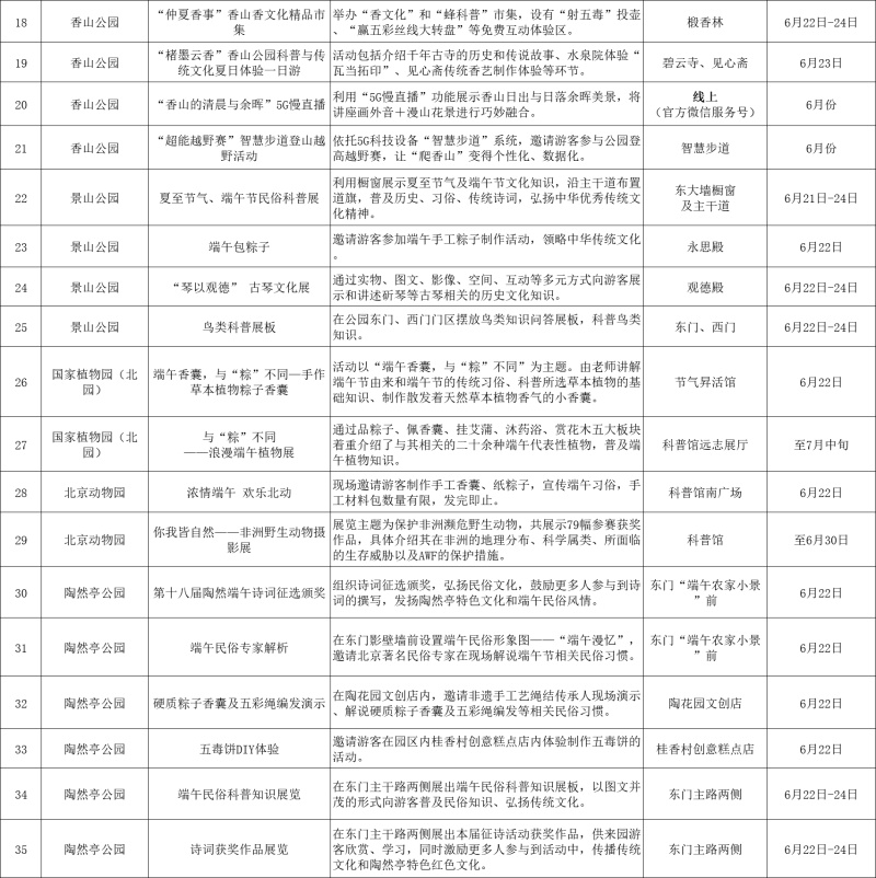 各类精彩的文化活动历来是北京公园的拿手好戏。景山公园“琴以观德”古琴文化展,将通过实物、图文、影像、空间、互动等多元方式向游客展示和讲述古琴相关的历史文化知识。中国园林博物馆“仲夏长物”2023年中国园林博物馆端午节文化活动精彩上演,囊括端阳好戏、夏日园居、植物星球等多个主题。紫竹院公园“从典籍里了解中国饮食礼仪”亲子研学活动,带领小朋友们深度游览友贤山馆、参观书吧,在《画中食》展览中,探寻中华饮食文化发展,深度探索中国传统文化里的餐饮讲究。香山公园的明星节目“香山奇妙夜”,将继续通过室内讲座、园内科普观察,让孩子们和家长们学习和了解不一样的香山,感受大自然的魅力。奥林匹克森林公园的 “奥森生活——城市森林音乐季第二季”,紫竹院公园的“和满京城 奋进九州”端午诗歌音乐会和居庸关长城的居庸关夜长城活动也值得一去。