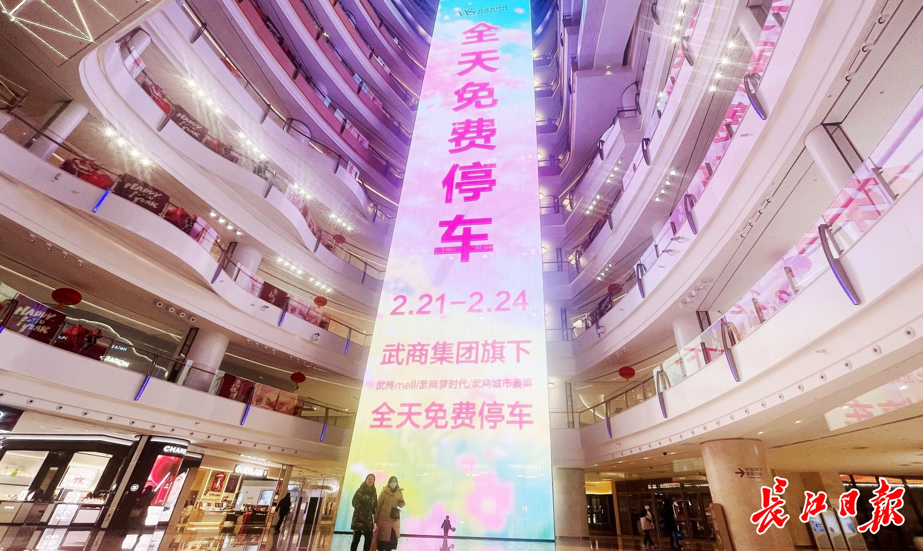 22日,武商梦时代大屏幕,播放武商集团旗下三大商业体免费停车的宣传语。长江日报记者何晓刚 摄