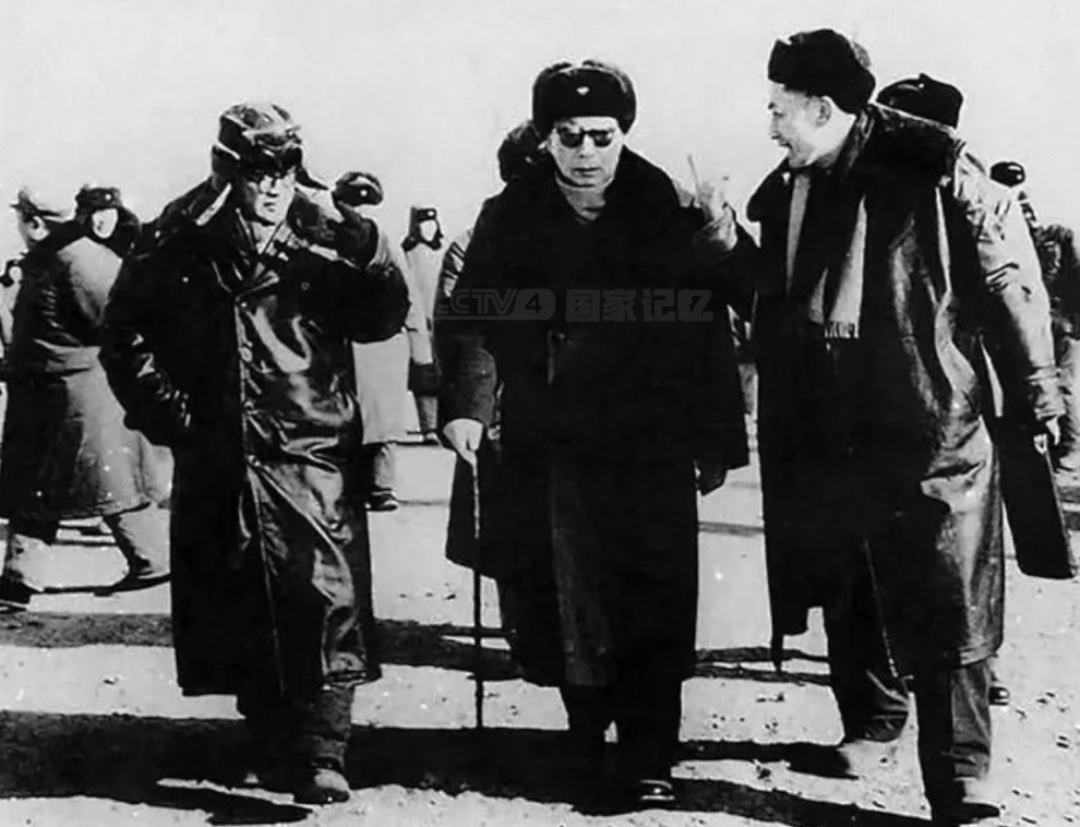△聂荣臻(中)、王淦昌(左)和朱光亚(右)在我国西部核试验基地