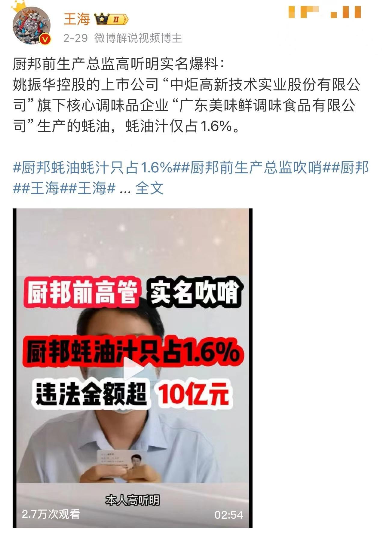 2月29日,打假博主@王海在微博发文称,厨邦前生产总监高听明实名爆料:上市公司“中炬高新技术实业股份有限公司”旗下的核心调味品企业“广东美味鲜调味食品有限公司”生产的蚝油,蚝油汁仅占1.6%,仅厨邦蚝油一项,涉嫌非法所得将超10亿元。