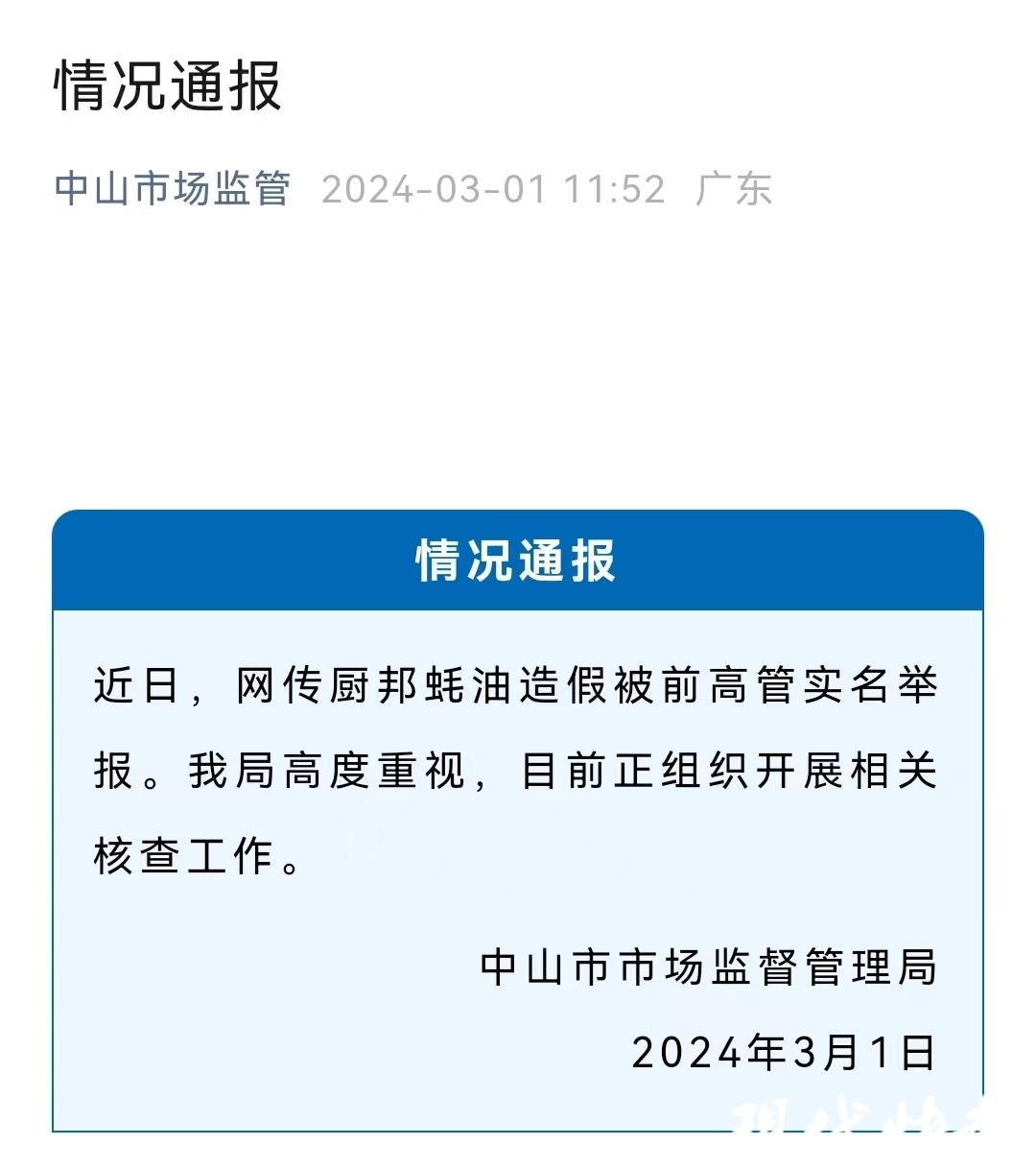 针对网传厨邦前高管实名举报厨邦蚝油造假一事,3月1日,广东省中山市市场监督管理局发布情况通报称,近日,网传厨邦蚝油造假被前高管实名举报,该局高度重视,目前正组织开展相关核查工作。