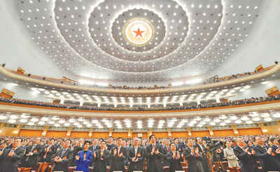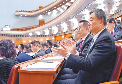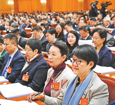 3月8日,十四届全国人大二次会议举行第二次全体会议。图为代表听取报告。