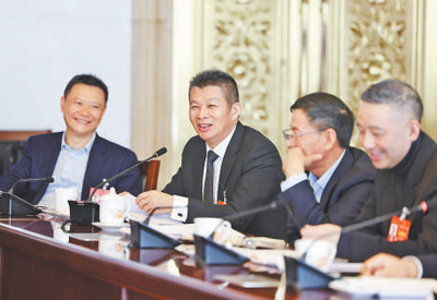 3月9日,刘建明代表(左二)在浙江代表团小组会议上发言。