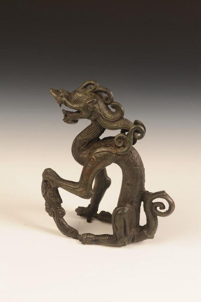这是目前为止我国金代考古发现最早的龙形器物,由黄铜铸造而成,通高19.6厘米,重2.1千克,龙呈蹲坐式,龙首微扬,张口似吟啸,肩微前躬,前左腿翘起,脚踏祥云,祥云与后腿相连;右前腿向前直立;龙尾上翘向外卷曲,威武雄姿,浩气凛然。