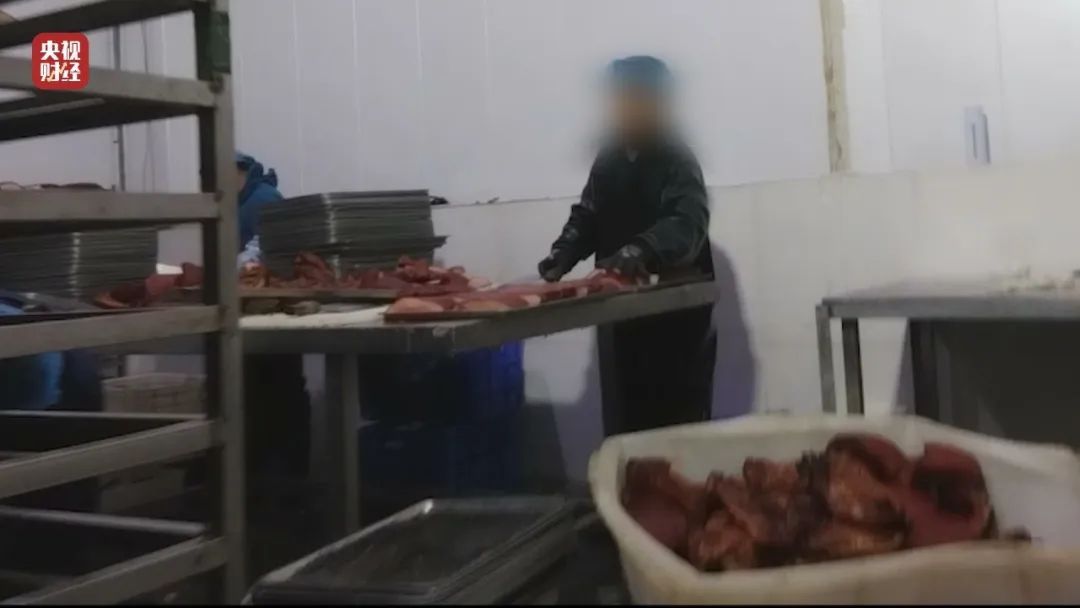 记者对当地多个冻品市场进行走访,不少商户向记者透露,用处理不干净的劣质槽头肉替代五花肉做梅菜扣肉预制菜,早已是公开的秘密。记者在多个预制菜生产企业看到,车间内摆满了用槽头肉做好的熟肉制品。在安徽厨先生食品有限公司的院子里,露天摆放着大量的冷冻槽头肉。有的甚至丢掉了外包装,肉完全暴露在了室外。室内,有工人将加工好的劣质槽头肉进行切片,有工人用槽头肉和梅菜进行装碗封装。