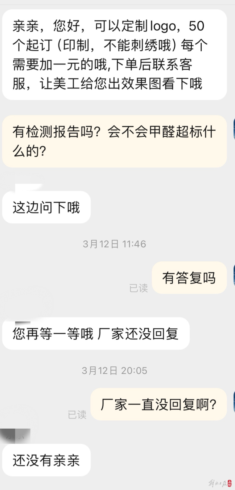 另一家客服也说,供应的娃娃没有生产信息和标签,但可以进行标志定制,“50个起订,每个加1元”。当记者询问质量是否可靠、能否提供检测报告时,客服表示要问一下厂家,但直到截稿,也没有回复。