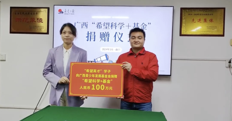 活动现场,陈宇良向广西青少年发展基金会捐赠“希望科学+基金”,自2024年起他将每年捐赠10万元,一直持续10年。