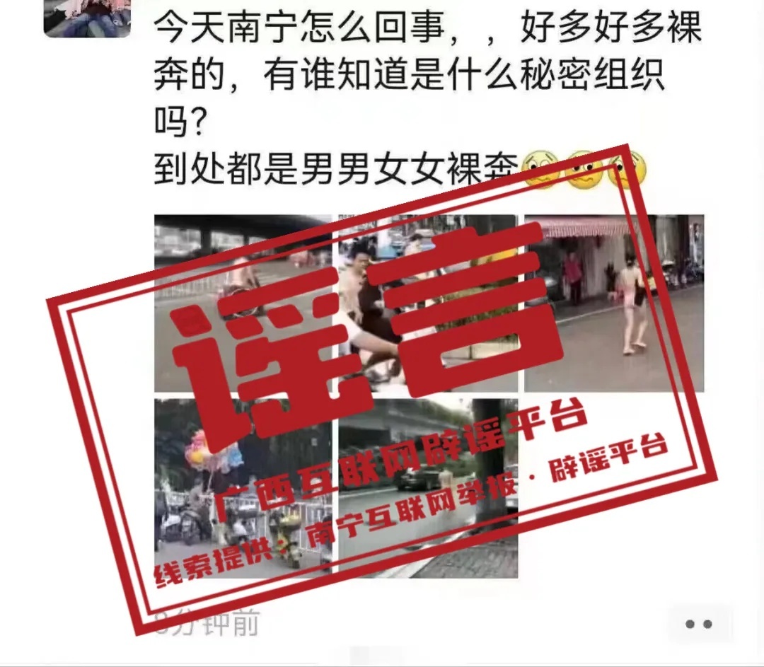 3月26日下午,广西互联网辟谣平台综合南宁互联网举报·辟谣平台发布《网传“南宁多人街头裸奔,疑似有组织”系谣言!》